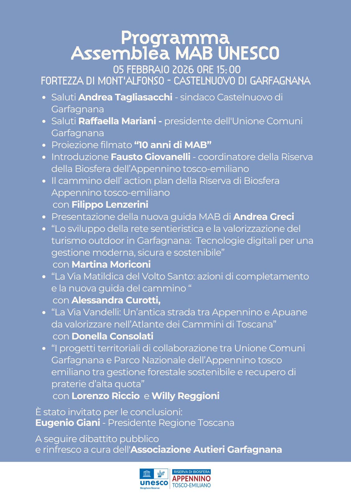 Giovedì 5 febbraio, a partire dalle ore 15, si terrà presso la Fortezza di Mont’Alfonso l’annuale Assemblea della Riserva di Biosfera Appennino Tosco-Emiliano in occasione del decennale del riconoscimento Unesco