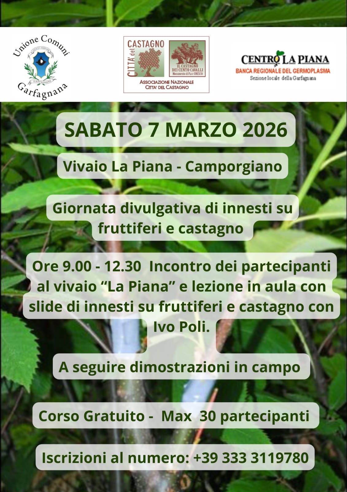 L’Unione Comuni Garfagnana, insieme all’Associazione Nazionale “Città del Castagno”, organizza per sabato 7 marzo una nuova giornata divulgativa con l’esperto Ivo Poli presso il proprio Centro per la valorizzazione della biodiversità vegetale