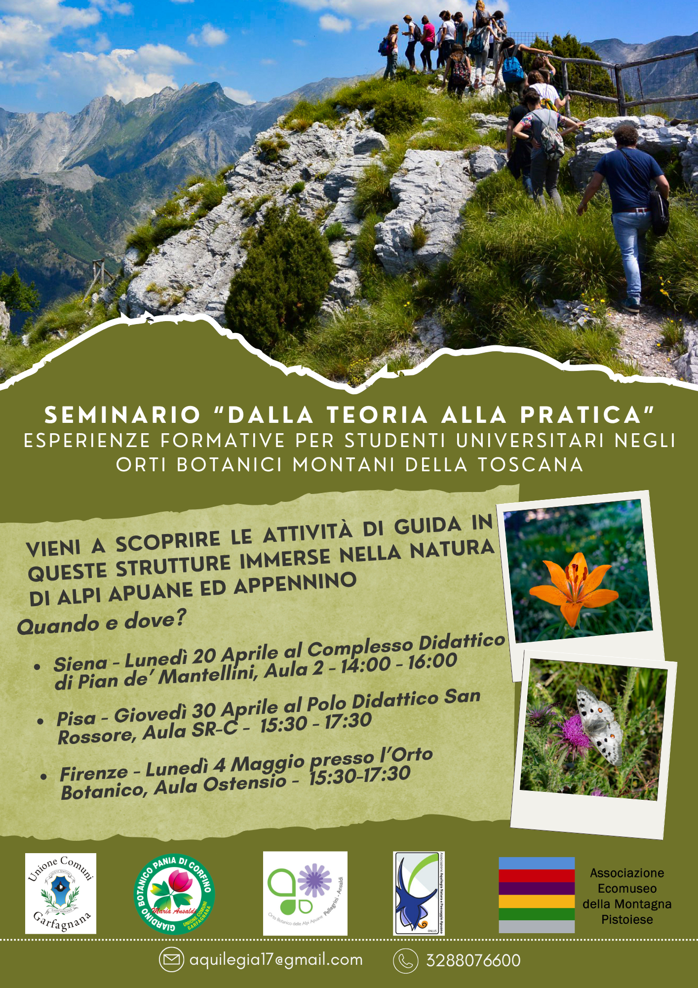 L’Unione Comuni Garfagnana parteciperà con il Giardino Botanico “Maria Ansaldi” Pania di Corfino al ciclo di seminari nelle Università di Pisa, Siena e Firenze per presentare le attività e le peculiarità dell’Orto e ricercare nuove guide tra gli studenti